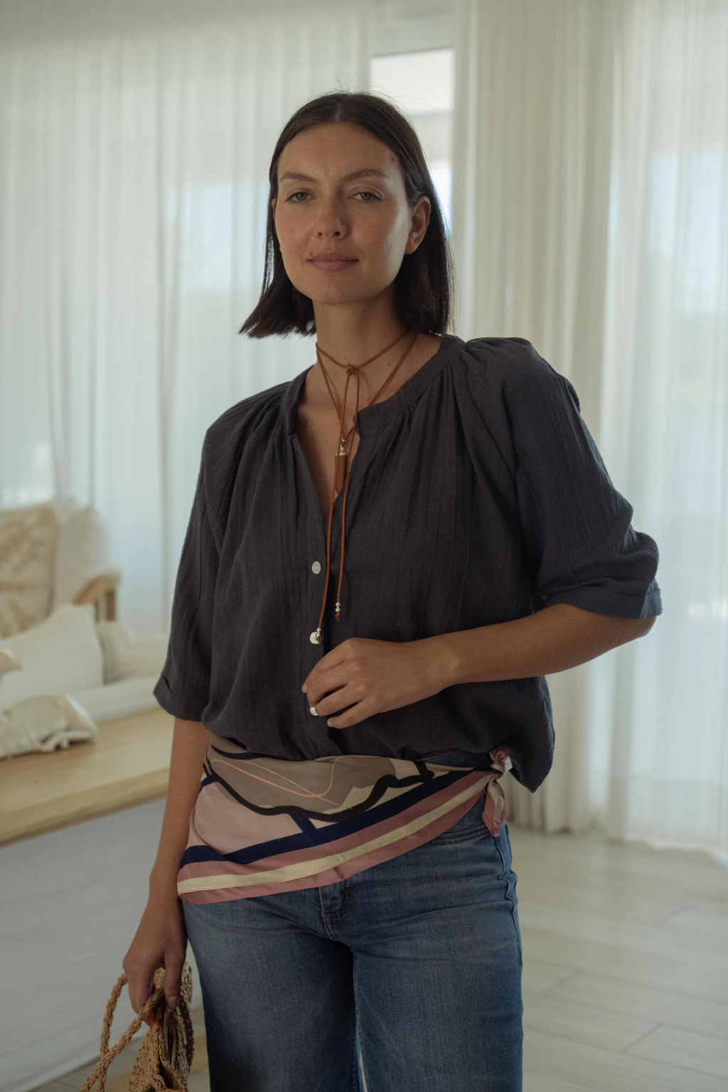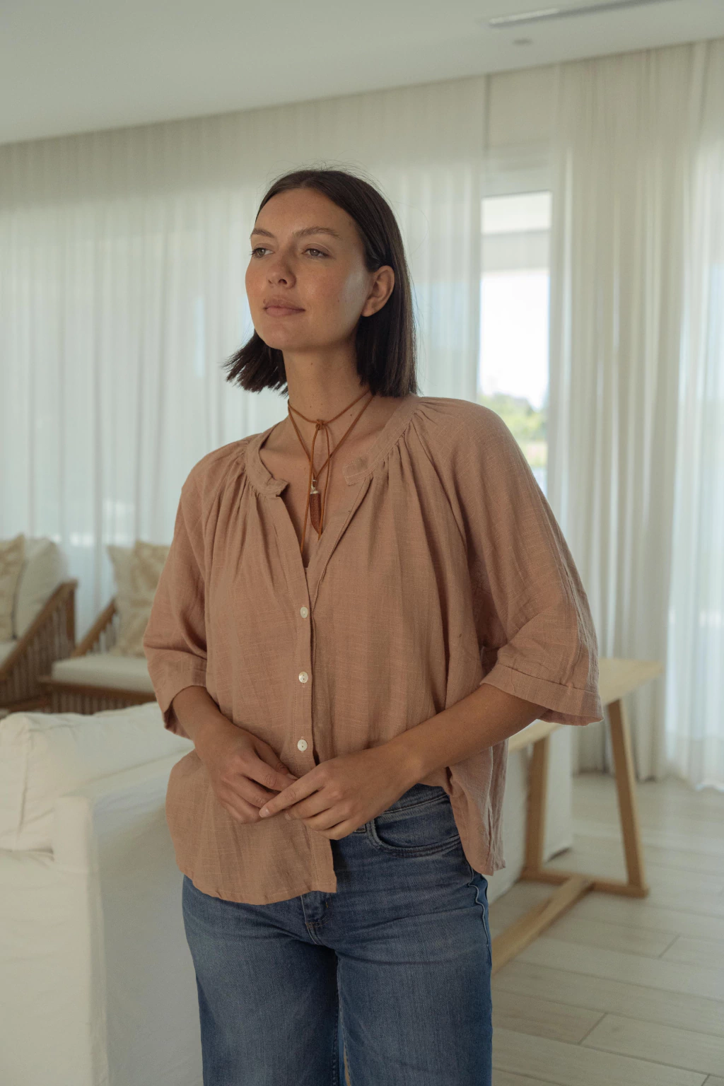 Camisa de Bambu de Lino con botones y cuello redondo.