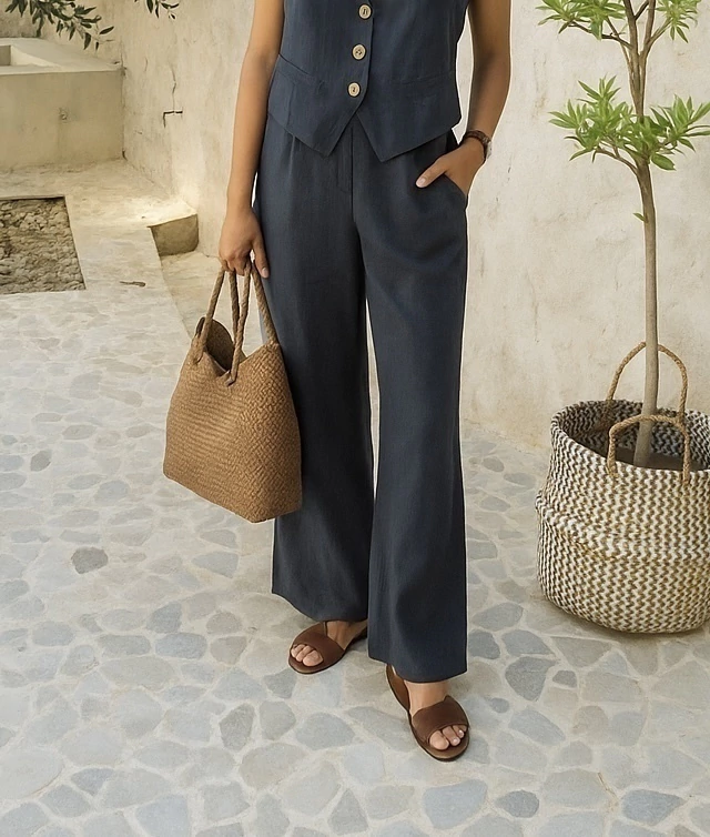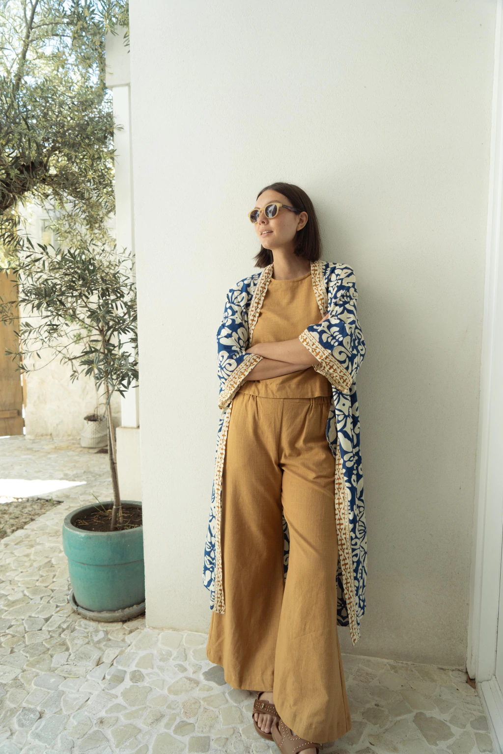 Pantalon de lino con cintura ancha, elastico en espalda y bolsillos. 100% algodon.