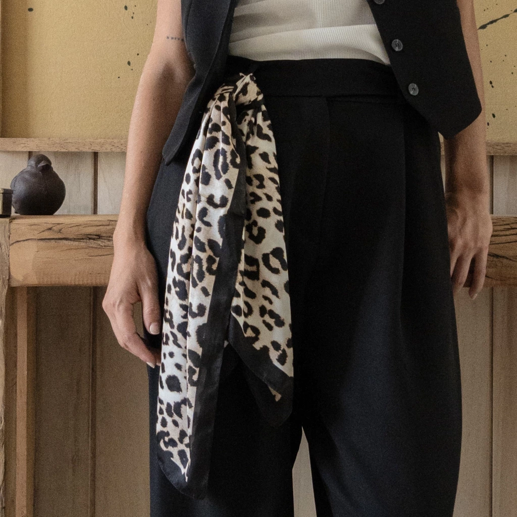 Pañuelo de sedita animal print con borde negro, 66x66cm