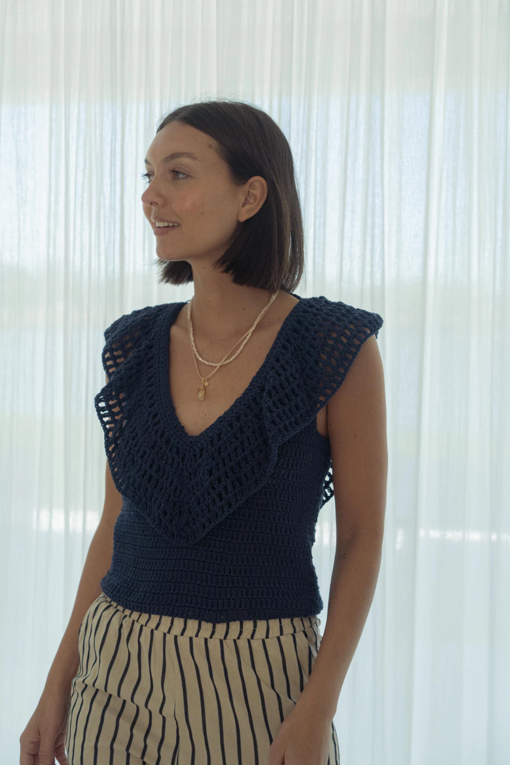 Top tejido a mano en crochet en hilo de algodon con volado en escote y espalda